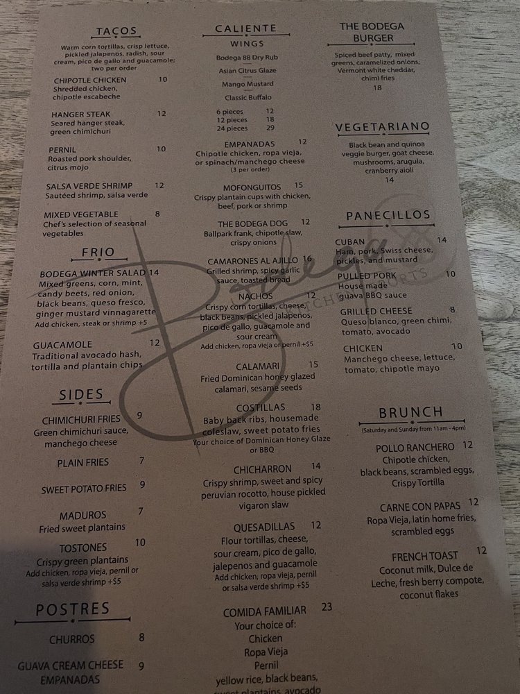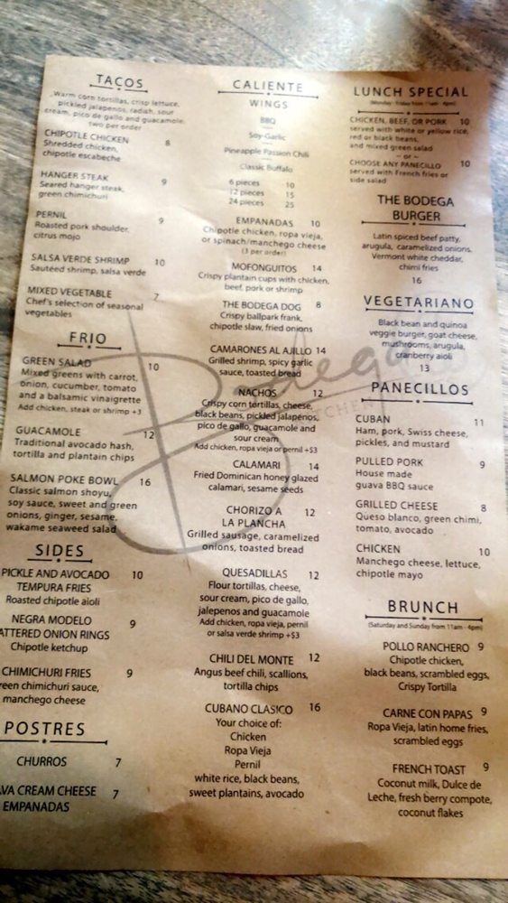 Bodega 88, a Latin American restaurant located in New York City, offers a vibrant and trendy dining experience. The menu features mouthwatering dishes like Caliente wings, Bodega Dog, and Camarones Al Ajillo. For lighter options, try the Bodega Mixed Greens or the Winter Salad from the Frio section. The Tacos selection includes Chipotle Chicken, Fish, and Pernil options. The Happy Hour specials are a hit among customers, with great deals on drinks and appetizers like Empanadas. The atmosphere is lively, with TV screens, a full bar, and a pool table for entertainment. Customers rave about the friendly service and delicious empanadas. Overall, Bodega 88 is a must-visit spot for delicious Latin American cuisine and a fun dining experience.